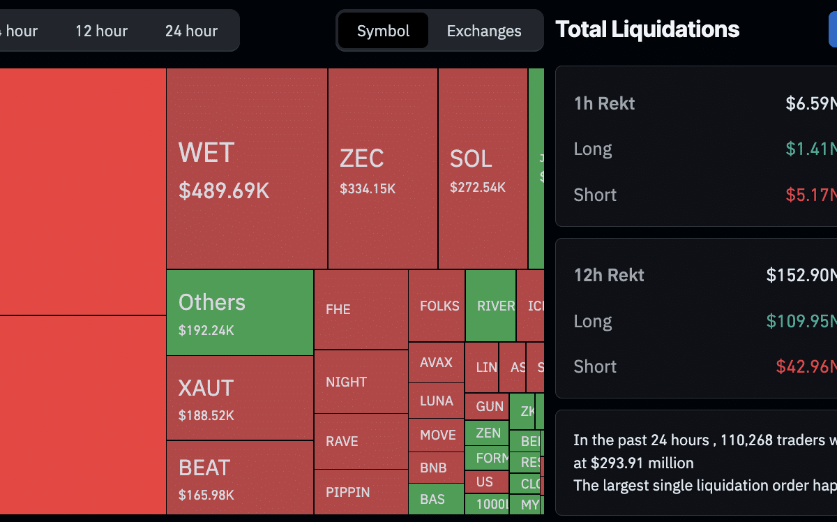 According to CoinGlass data, over $293M in leveraged positions has been wiped out over the last 24 hours, with $231M from long trades and $62M from short trades. This indicates bears are in control, but bulls remain optimistic and are still attempting to go long in the market.