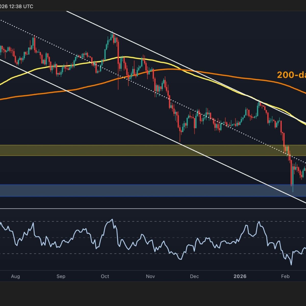 In addition, BTC is still moving beneath the descending trendline that has guided the correction for months, which means the buyers have not yet delivered a convincing structural reversal.