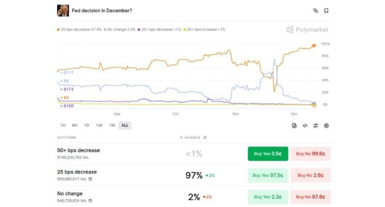 Polymarket users forecast 97% probability of 25 bps rate cut